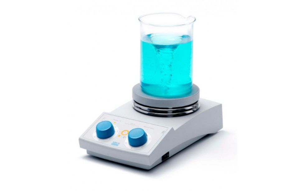 Versatile hot plate stirrer with powerful motor, enhanced magnet coupling and excellent resistance to chemicals, hot top warning and safety heating switch.