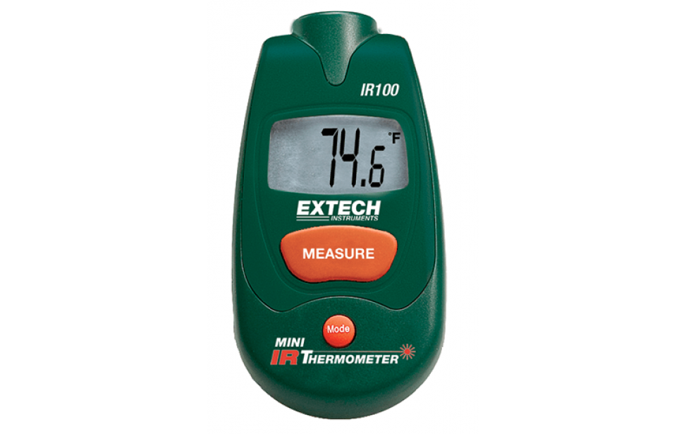 The Extech IR100 Mini IR Thermometer has a temperature range from -34 to 446ºF. Its fixed 0.95 emissivity covers 90 percent of all surface applications. Meter has an economical miniature sized design for better convenience. This thermometer features automatic data hold when the measure button is released and it has max/min hold and an auto power off function. Also, there is a lock feature for continuous scanning. The Extech IR100 Mini IR Thermometer comes complete with a CR 2032 3V battery.